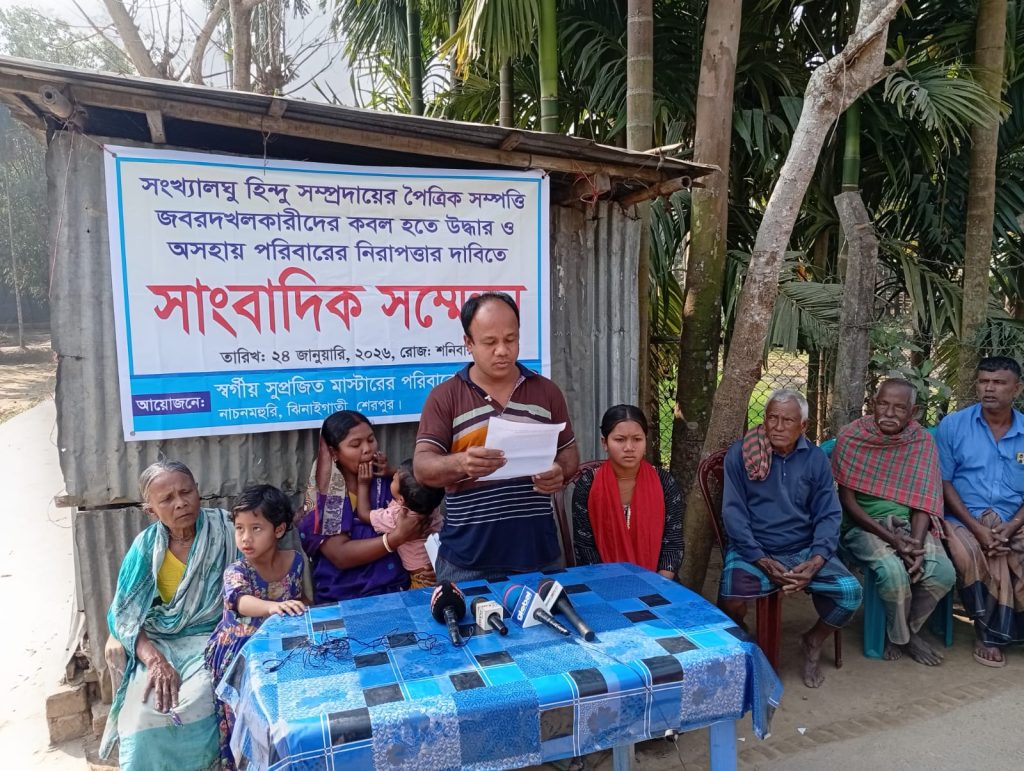 শেরপুরের ঝিনাইগাতী উপজেলার কাংশা ইউনিয়নের নাচন মুহুরি হিন্দু পাড়া গ্রামে পৈত্রিক সম্পত্তি প্রভাবশালীদের কবল হতে উদ্ধার ও সংখ্যালঘু হিন্দু পরিবারের নিরাপত্তার দাবিতে সাংবাদিক সম্মেলন করেছেন শ্রী সঞ্জয়।