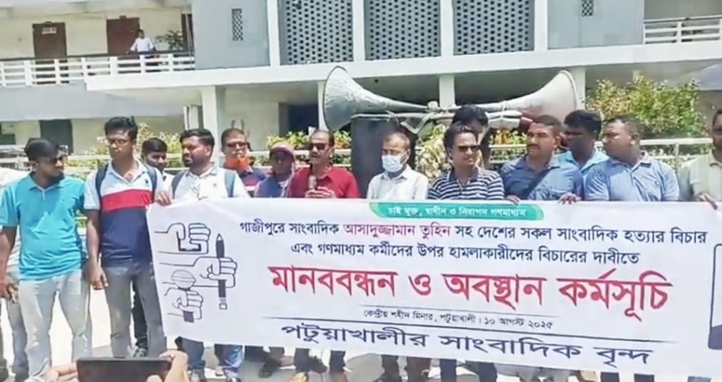 সাংবাদিক আসাদুজ্জামান তুহিন হত্যার প্রতিবাদে পটুয়াখালীতে জেলার সকল সাংবাদিকদের উদ্ধোগে মানববন্ধন ও অবস্থান কর্মসূচি অনুষ্ঠিত হয়েছে।