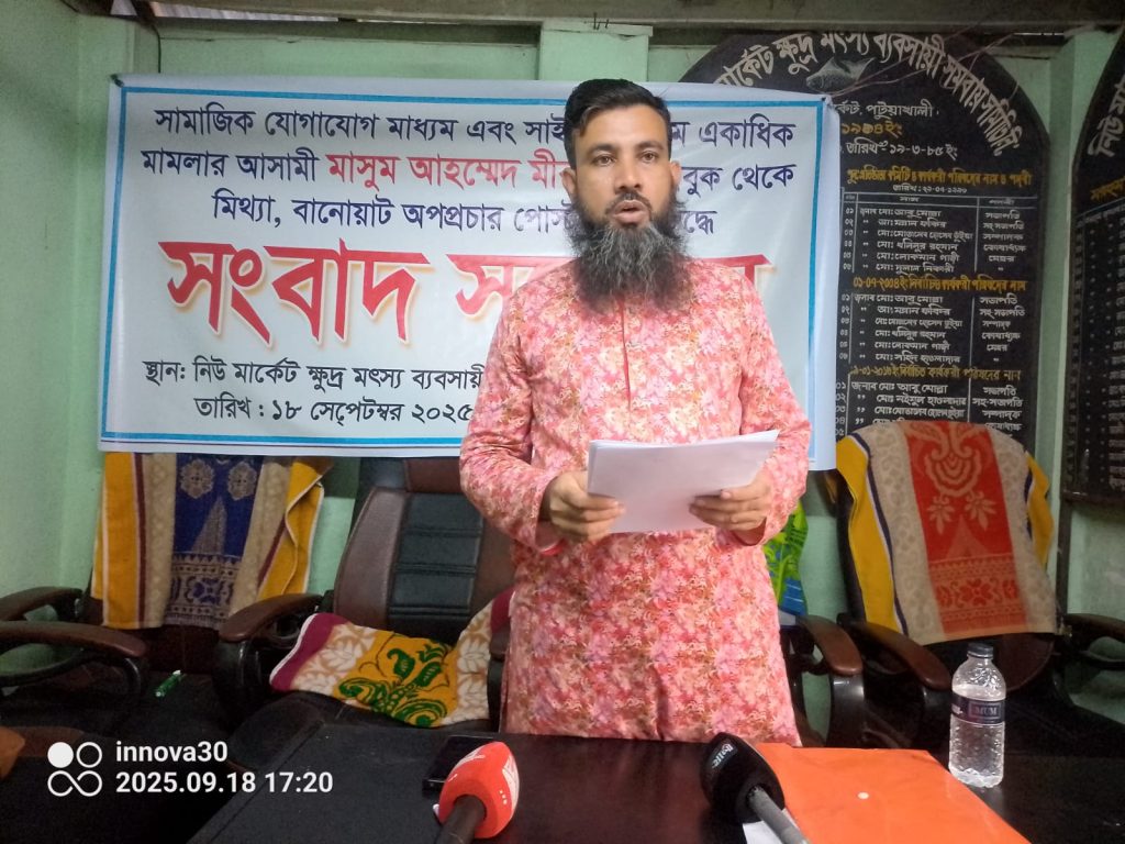 পটুয়াখালী নিউ মার্কেটের বিশিষ্ট ব্যাবসায়ী ও পটুয়াখালী নিউ মার্কেট ক্ষুদ্র মৎস্য সমবায় সমিতির কার্য নির্বাহি কমিটির নির্বাচিত বর্তমান ক্যাশিয়ার ও বাংলাদেশ জাতীয়তাবাদী দল বিএনপির পটুয়াখালী জেলা শাখার রাজনৈতিক সমাজসেবক জনাব মোঃ শামীম মৃধা সোসাল মিডিয়ায় মিথ্যা অপ্রচারের বিরুদ্ধে সংবাদ সম্মেলন করেন।
